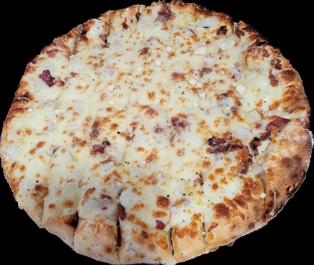 Great by itself, awesome when you add toppings!Alfredo Sauce, Spinach, Moz & Provolone, Parm