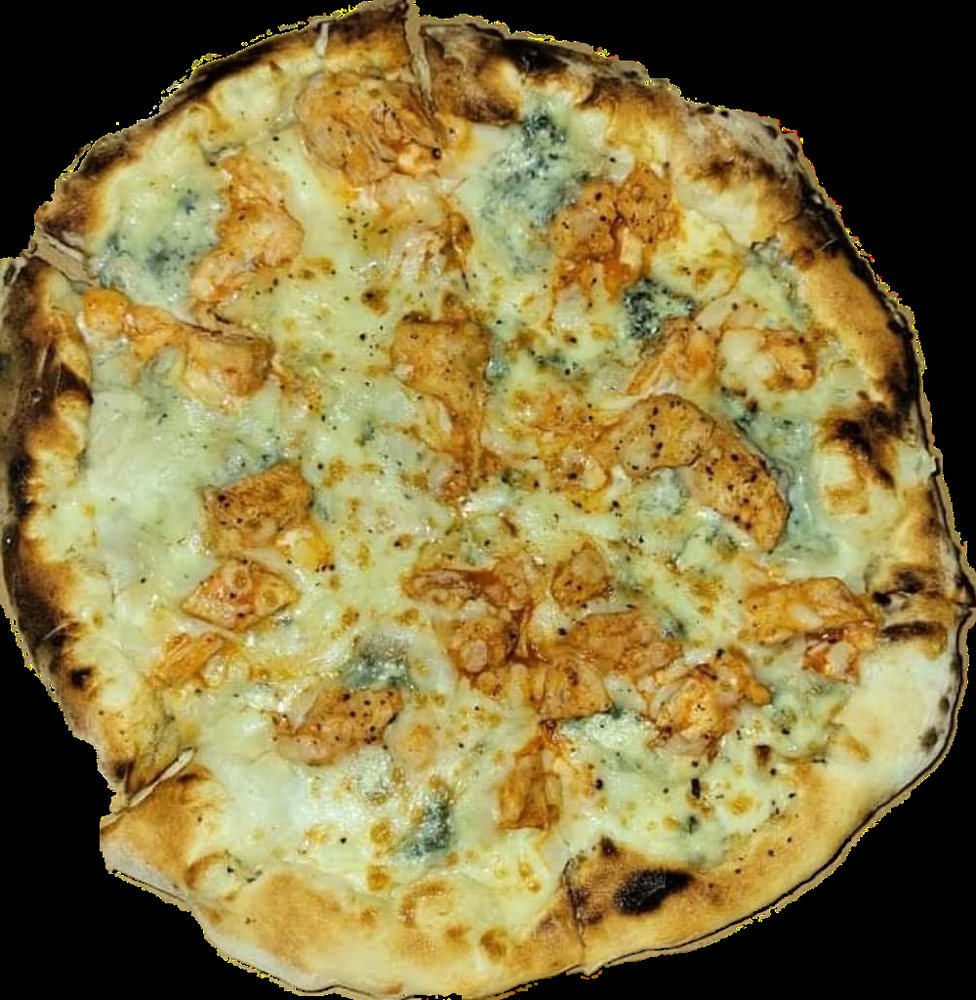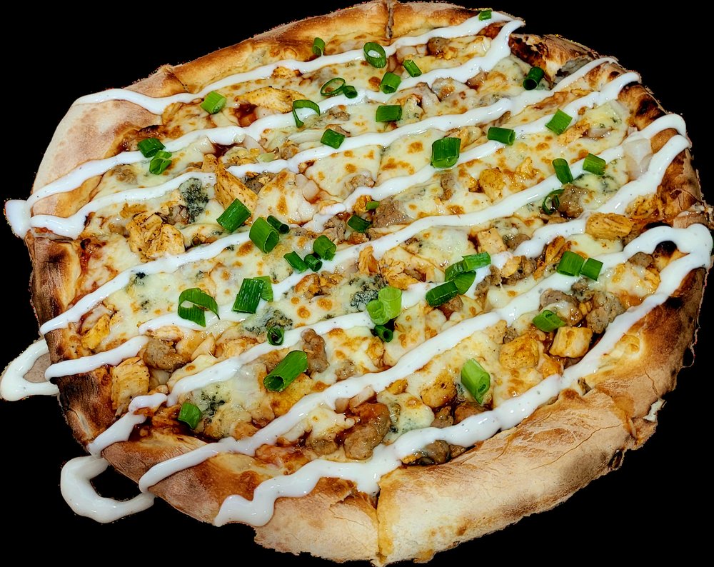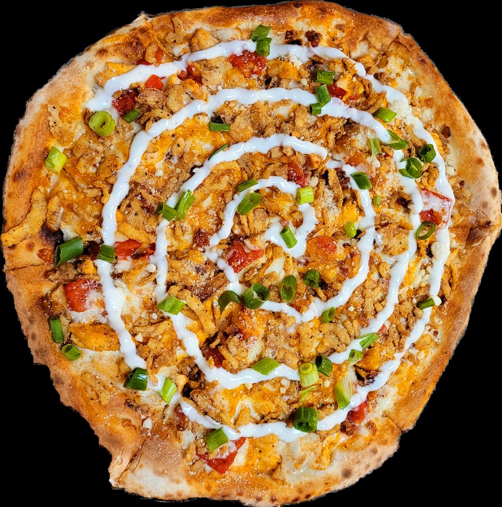 Second only to our LaSagna!Ranch Sauce, Smoked Chicken Breast soaked in Hot Sauce, Onions, and Spice Blend. Even if you do not like buffalo, you will like this. Like it hot? Order an extra dose of Hot Sauce on the top!