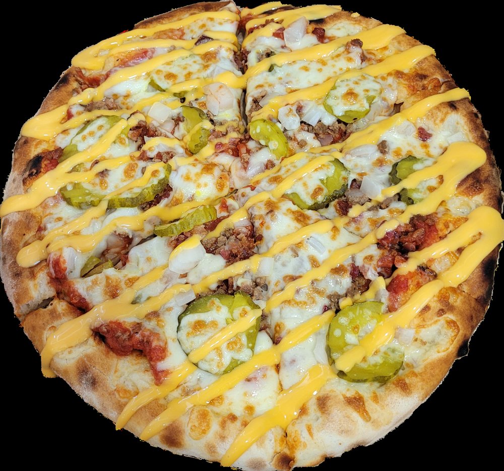 Want some backyard wood-fired yum??? Beef, Bacon, Onion, Pickles, Cheddar Cheese Sauce Drizzle