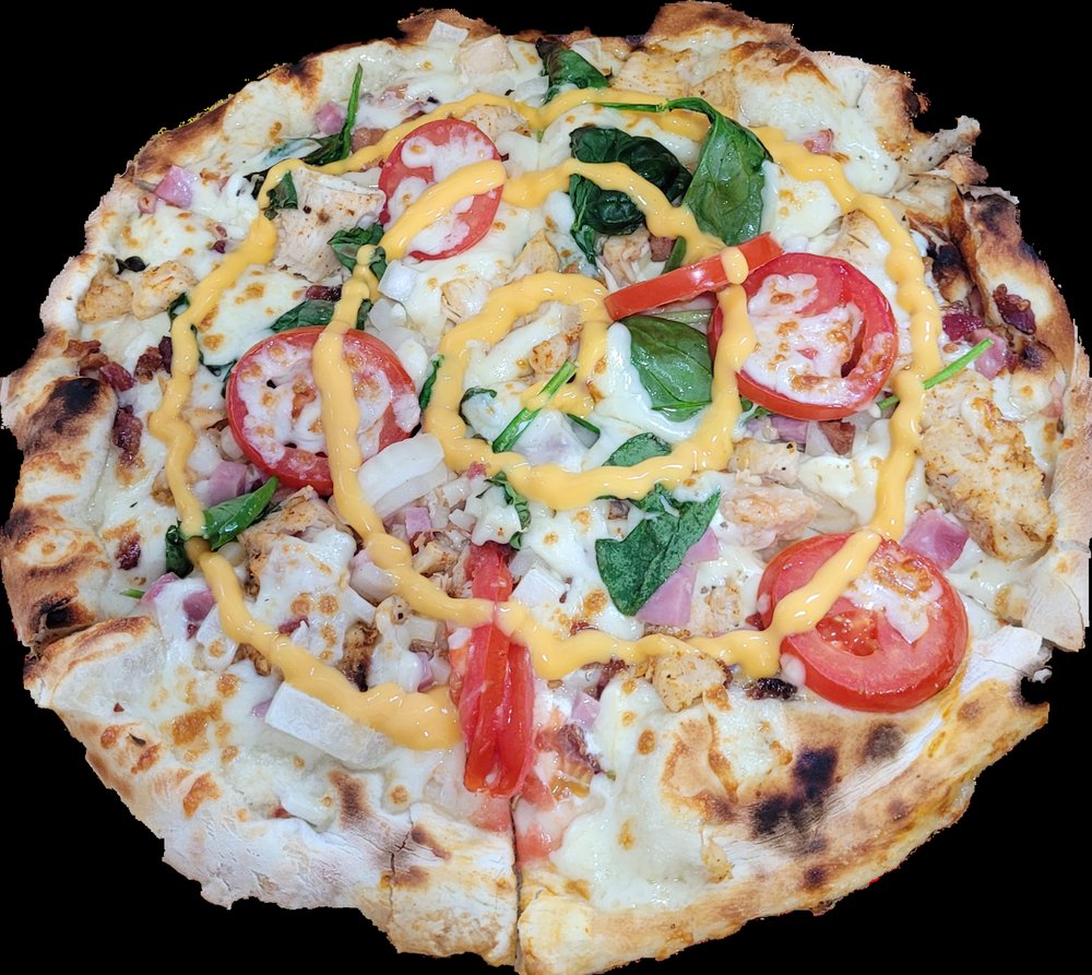 An awesome twist to a classic great! Featuring Robsagna Smoked Chicken, Ranch, Bacon, Tomato, with French Fried Onions on Top.